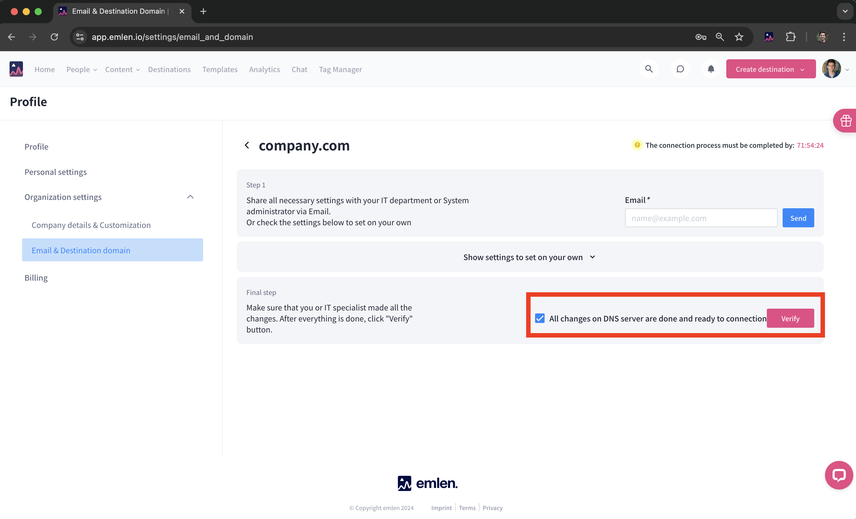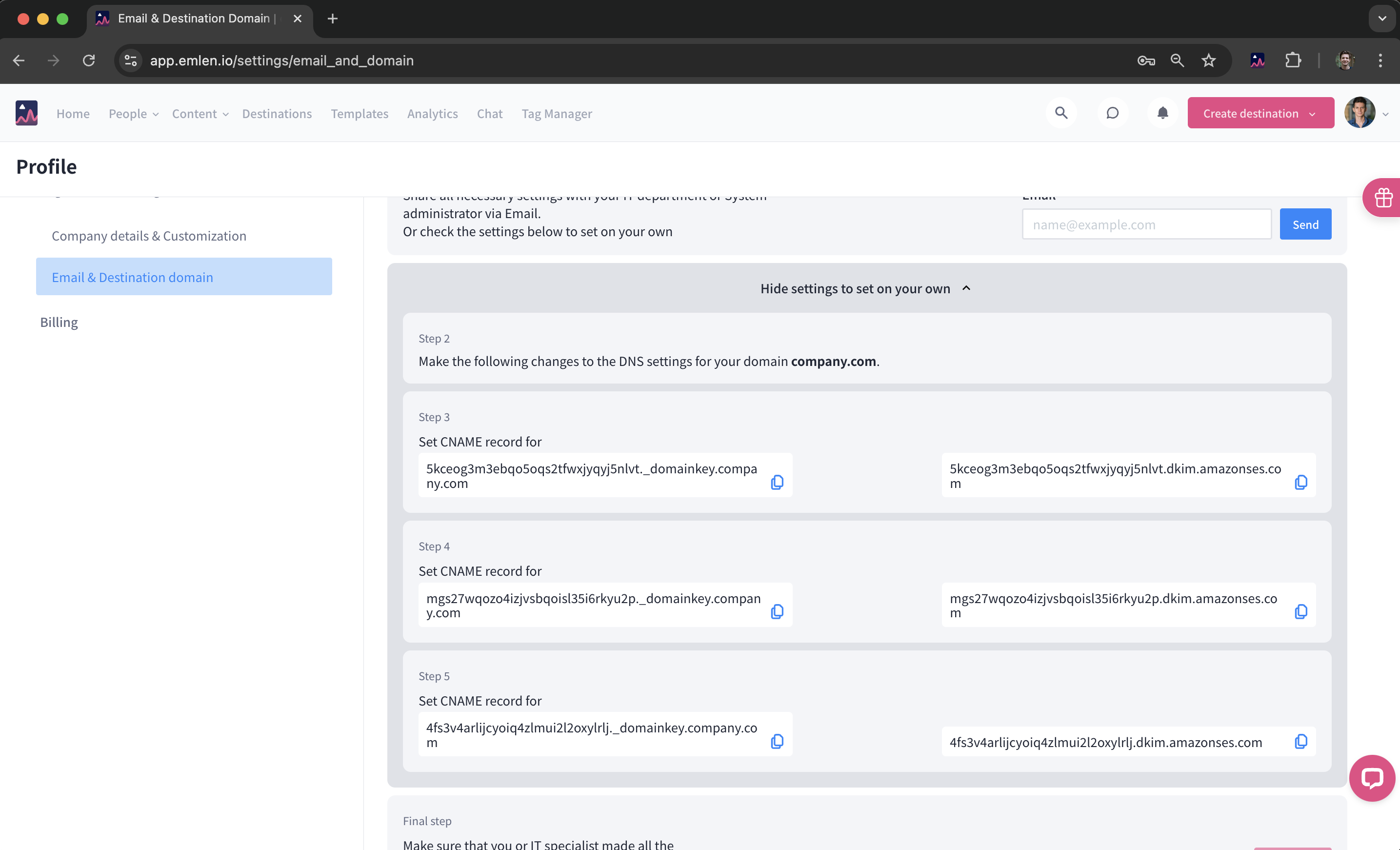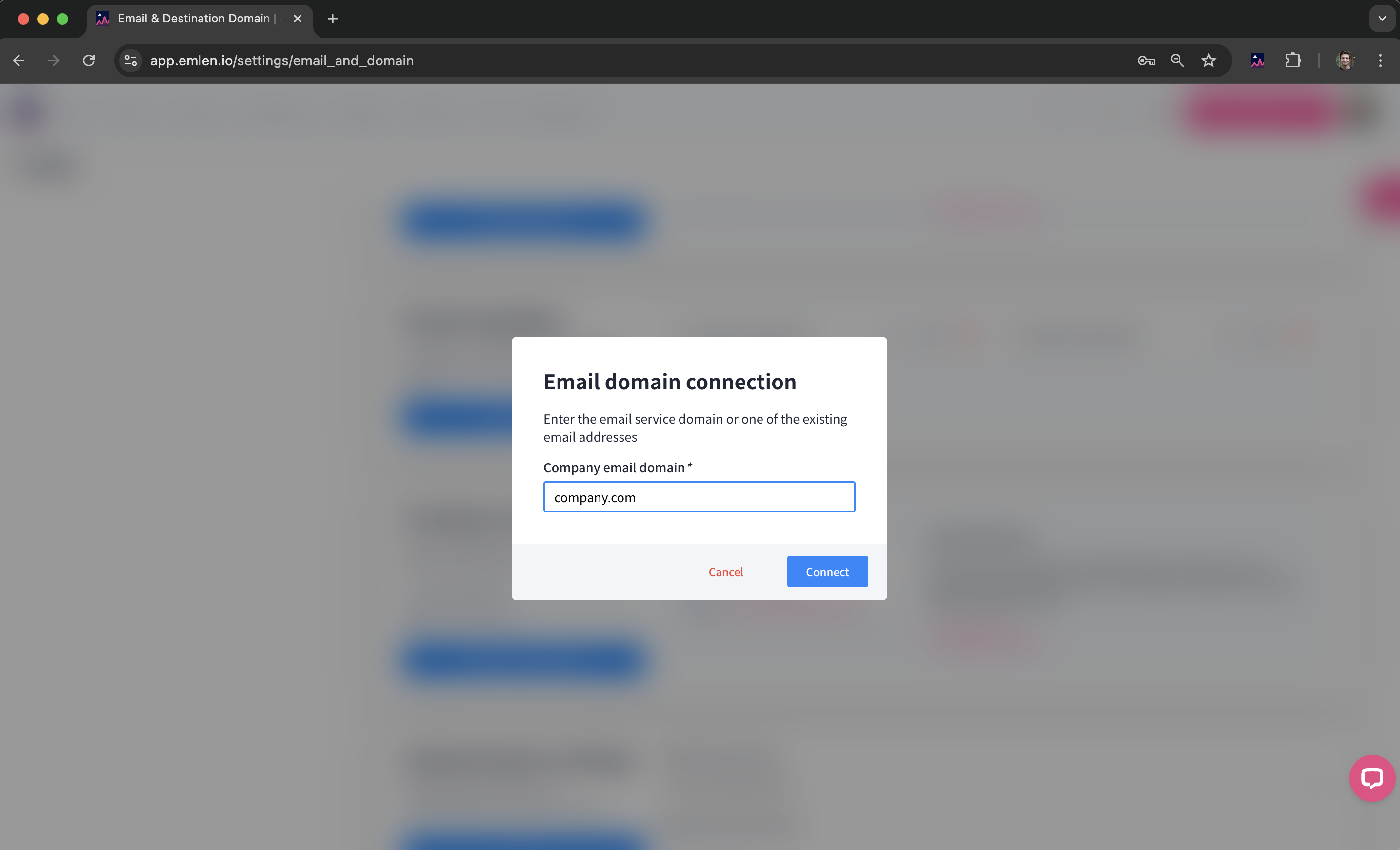 This guide will help you connect your company email domain to emlen so you can send emails (like Destination update notifications) from your business email via emlen.