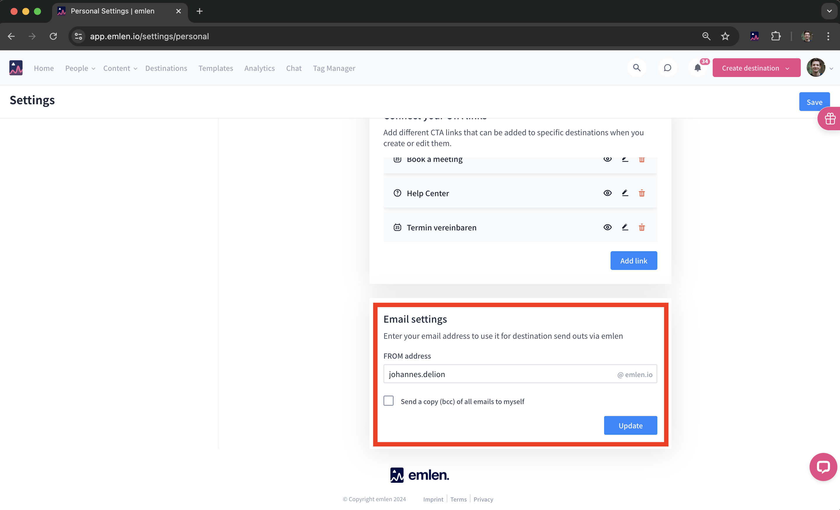 After connecting, each emlen user needs to enter their business email address in their profile. This is necessary for outgoing emails to display their email address as the sender. Please ensure everyone on the team is informed to complete this step.