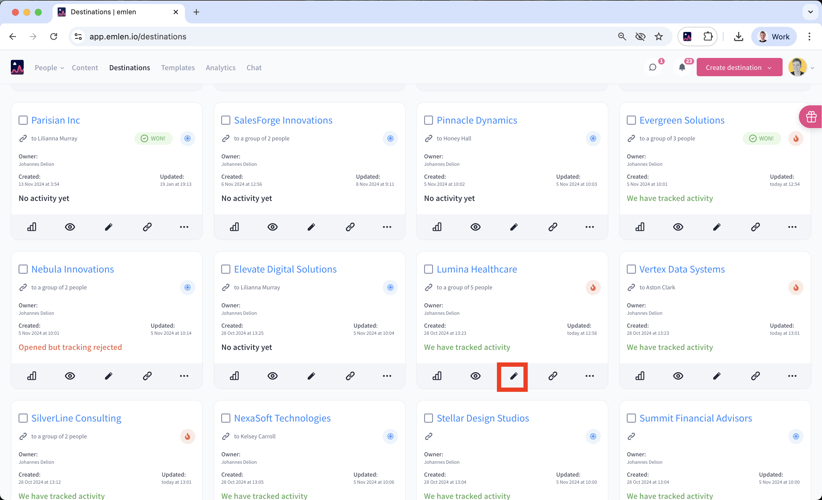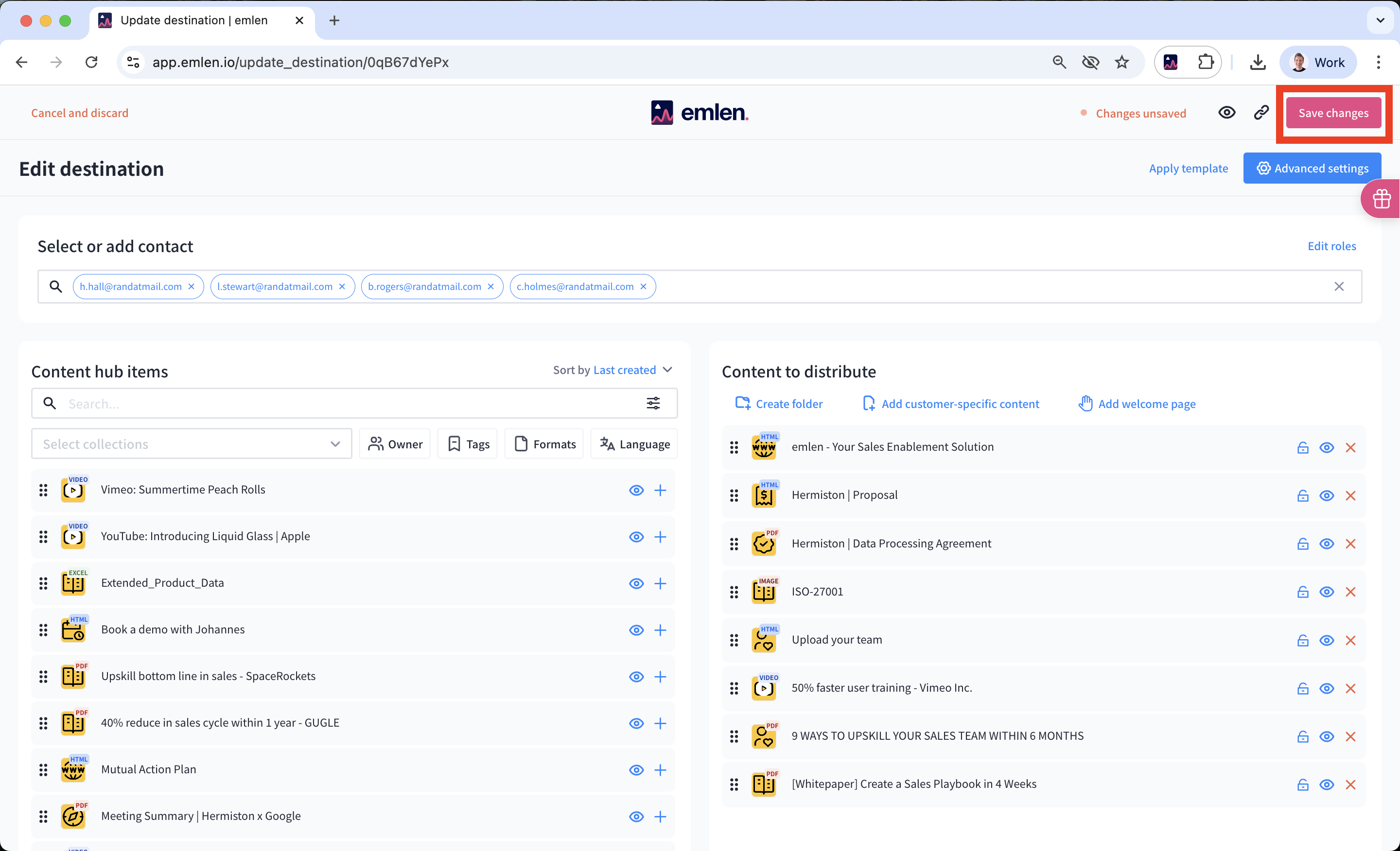 Share only the essential content for your buyer’s current stage in the purchase process. As the deal progresses and more stakeholders get involved, you can update the Destination with new content. To edit a Destination, click “Edit” and make your changes (add or remove content, update the welcome page, etc.), then click “Update.”