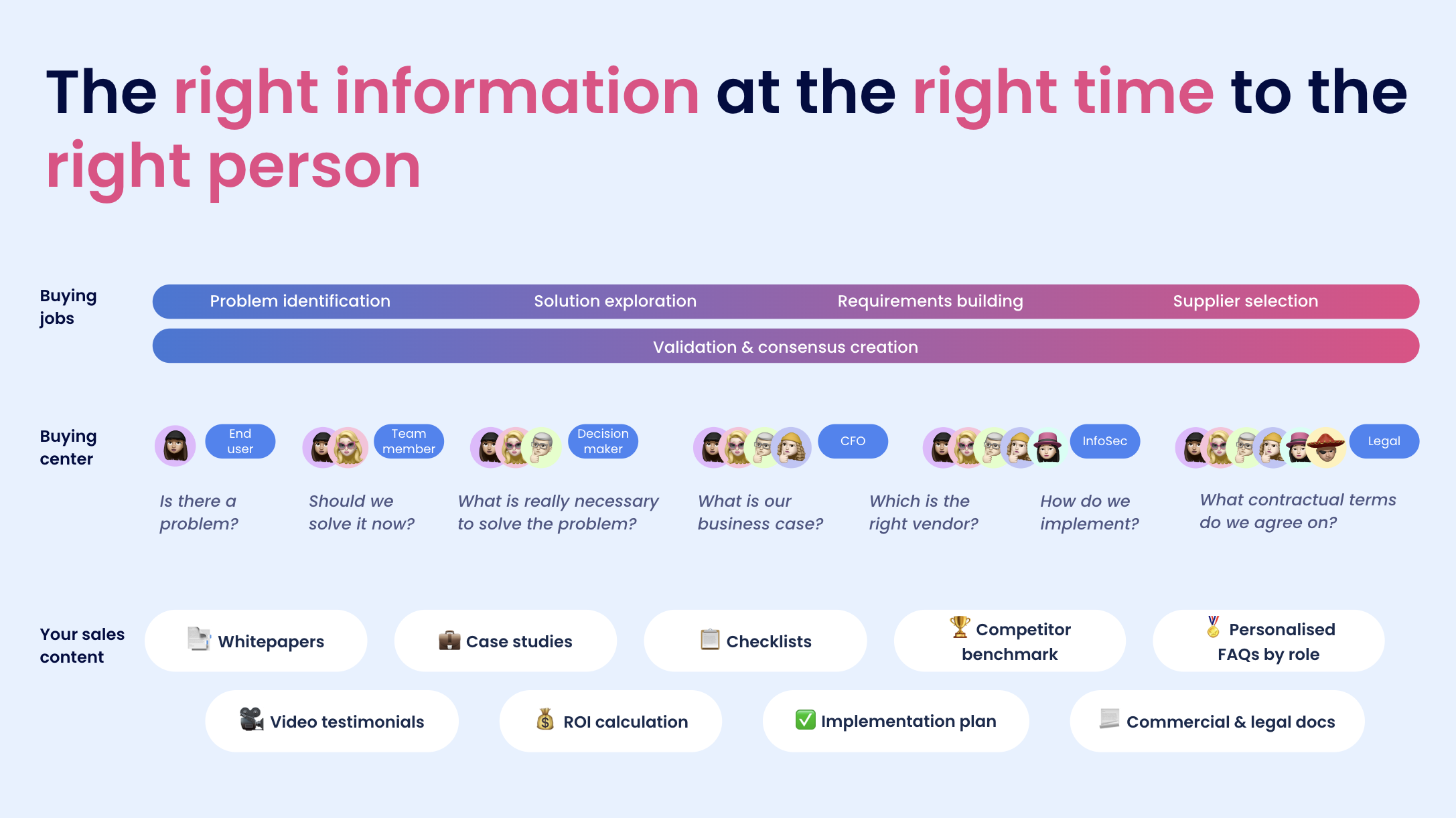 As the buying process advances, more stakeholders typically join the decision. Often, a sales champion shares information internally, which can limit your visibility and control. While a strong champion can help, it’s better to get all stakeholders into the Destination. This ensures you can directly meet their information needs and maintain transparency. For more, see the article on multithreading with emlen.