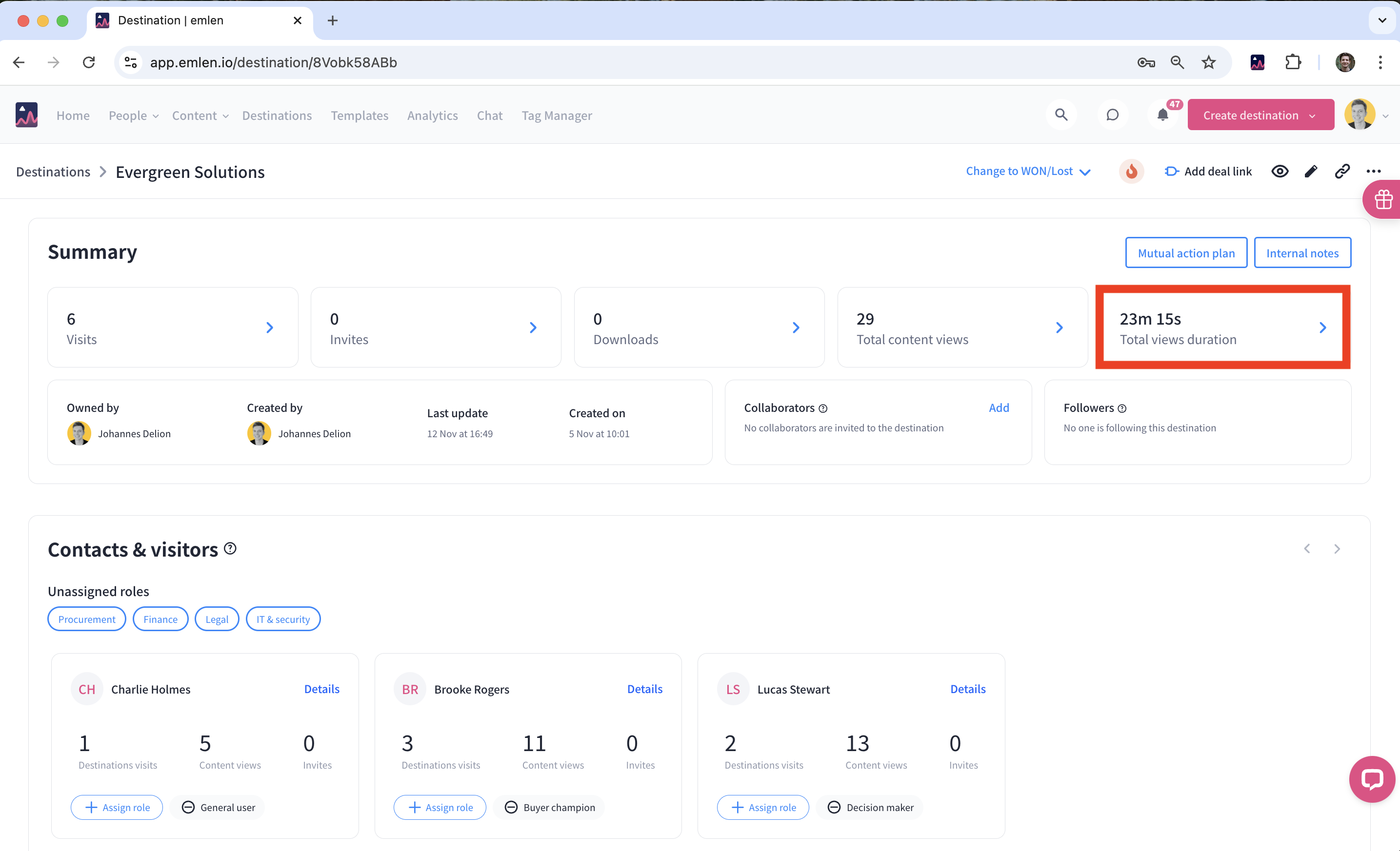 Buyer engagement refers to the total time buyers spend in a Destination (= total views duration). For example, in this case, it’s 23 minutes and 15 seconds.