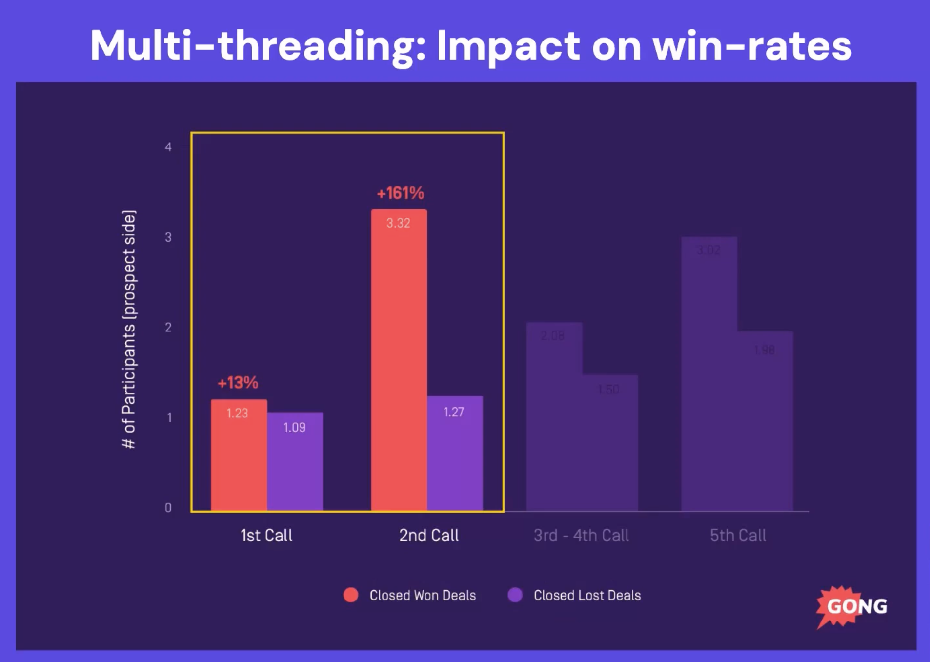 Multithreading is essential for success in B2B sales. According to Gong, deals that close successfully involve approximately three times more contacts by the second call compared to those that do not close.