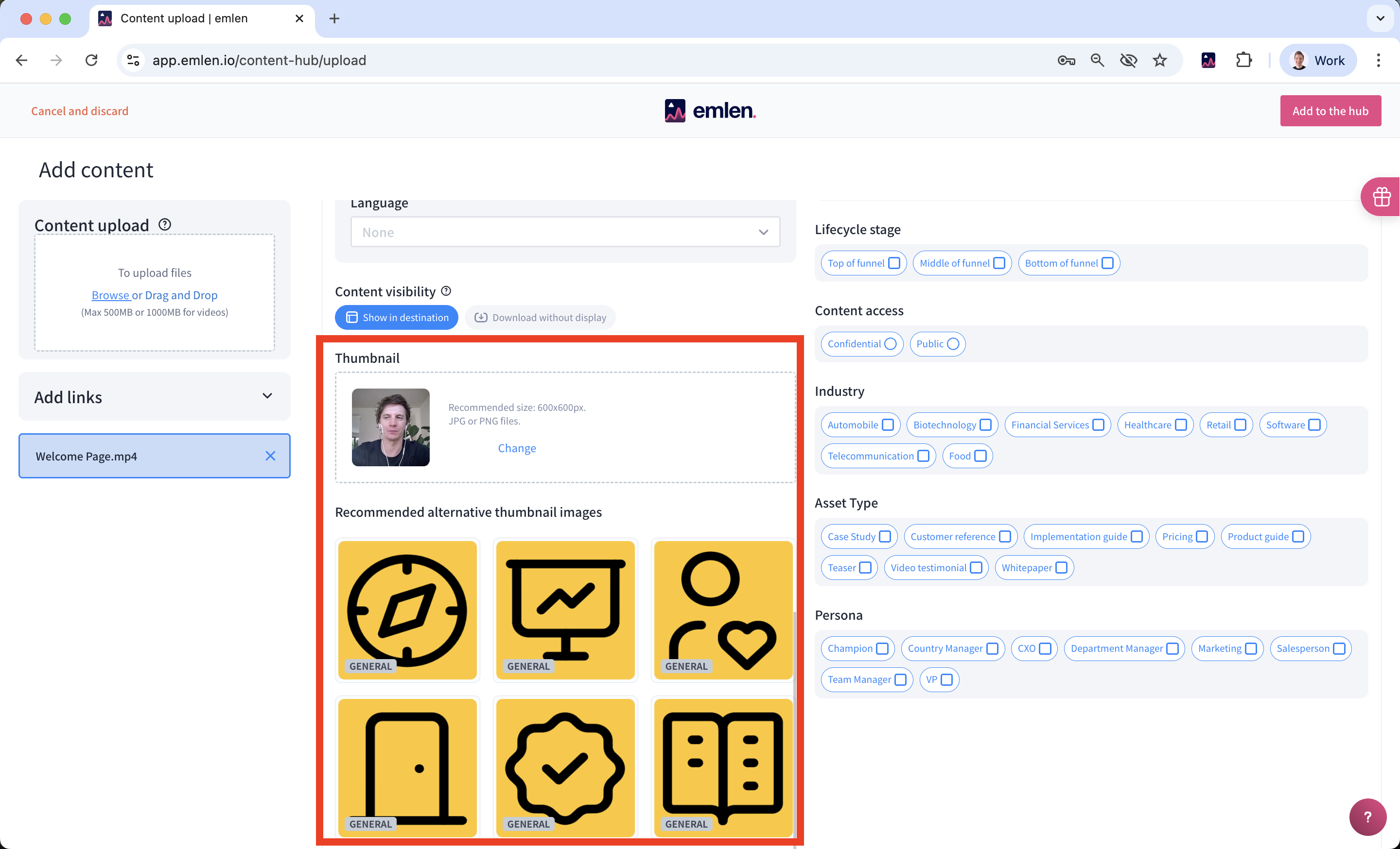 Once uploaded, go to the Content Hub to edit and assign thumbnails to content assets. If no assets have been uploaded yet, you can do so during the upload process.