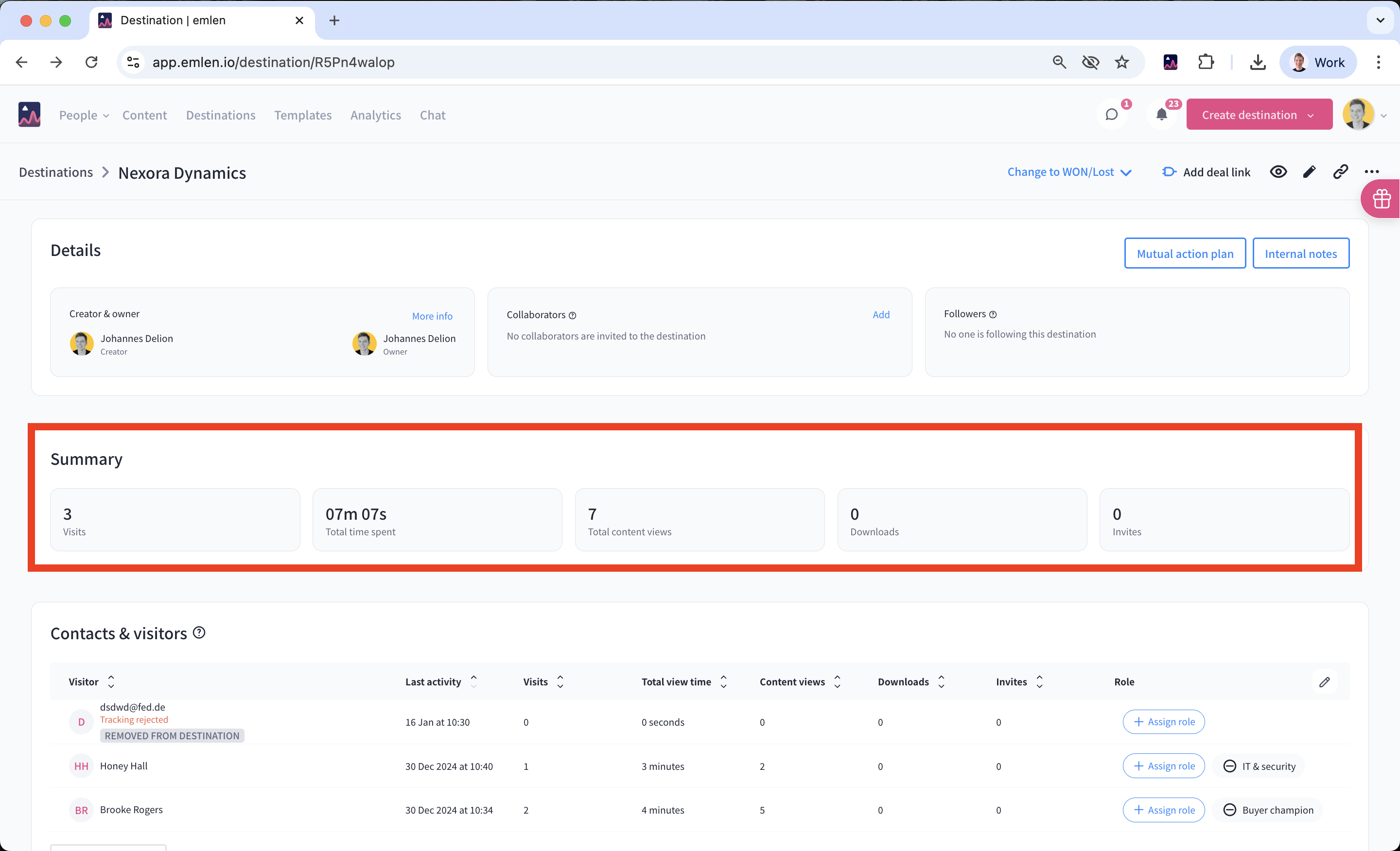 - To see contact-level analytics, enable email verification by choosing “Contact tracking” or “Only invited people” in the template / Destination settings