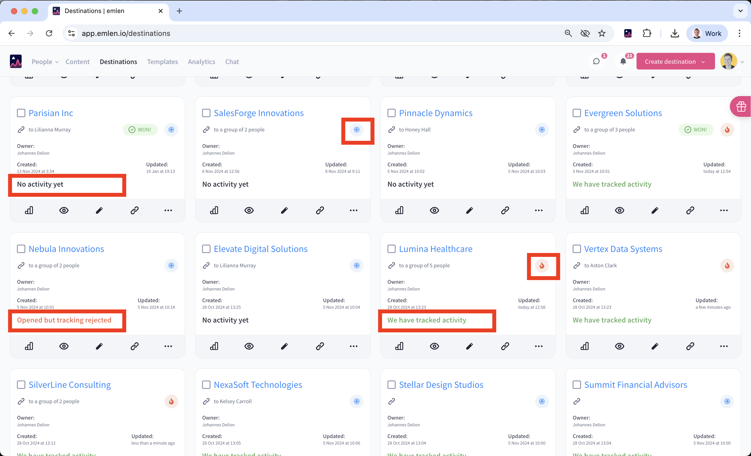 In the Destination overview, you can see all the Destinations created by you or your team. Use this view to manage and prioritize your leads / deals. There are three activity statuses: